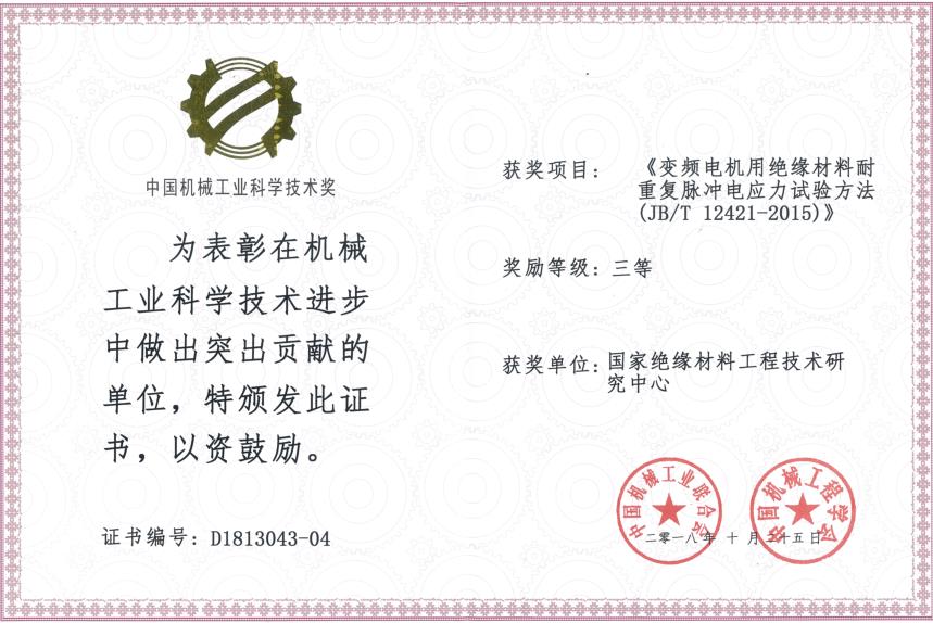 由中國機械工業(yè)聯(lián)合會和中國機械工程學(xué)會共同設(shè)立“中國機械工業(yè)科學(xué)技術(shù)獎”,是中國機械領(lǐng)域最具權(quán)威的獎項之一。近日,2018年度中國機械工業(yè)科學(xué)技術(shù)獎獲獎項目公布,我公司(國家絕緣材料工程技術(shù)研究中心)參與制定的行業(yè)標(biāo)準(zhǔn)JB/T12421-2015《變頻電機用絕緣材料耐重復(fù)脈沖電應(yīng)力試驗方法》榮獲 ...