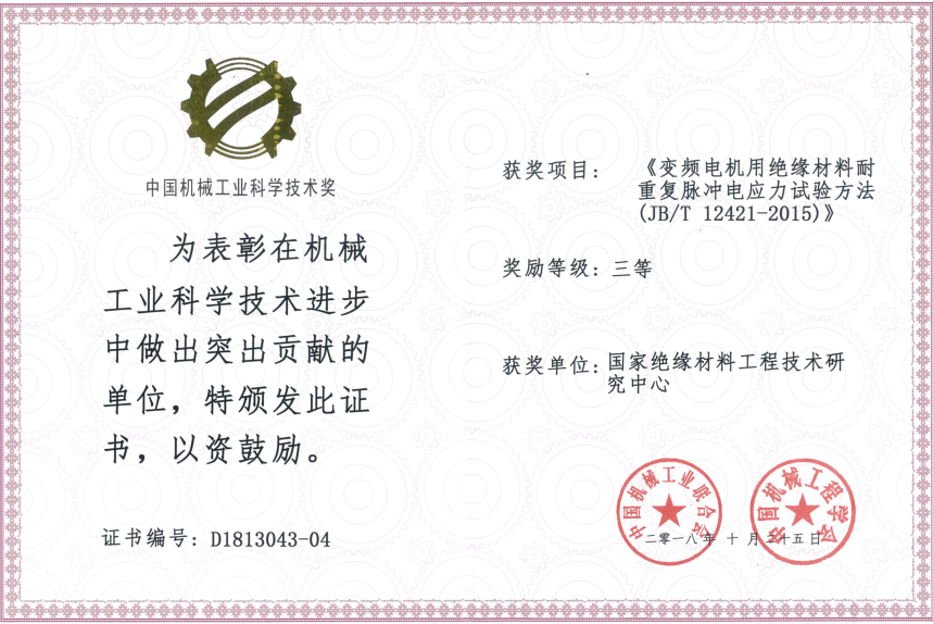由中國機(jī)械工業(yè)聯(lián)合會和中國機(jī)械工程學(xué)會共同設(shè)立“中國機(jī)械工業(yè)科學(xué)技術(shù)獎(jiǎng)”,是中國機(jī)械領(lǐng)域最具權(quán)威的獎(jiǎng)項(xiàng)之一。近日,2018年度中國機(jī)械工業(yè)科學(xué)技術(shù)獎(jiǎng)獲獎(jiǎng)項(xiàng)目公布,我公司(國家絕緣材料工程技術(shù)研究中心)參與制定的行業(yè)標(biāo)準(zhǔn)JB/T12421-2015《變頻電機(jī)用絕緣材料耐重復(fù)脈沖電應(yīng)力試驗(yàn)方法》榮獲 “中國機(jī)械工業(yè)科學(xué)技術(shù)獎(jiǎng)” 三等獎(jiǎng)。此次獲獎(jiǎng)?wù)f明公司一如既往的發(fā)揮著行業(yè)示范帶頭作用,爭先擁有規(guī)則的話語權(quán),為公司提高核心競爭力和產(chǎn)品創(chuàng)新能力提供了助力。